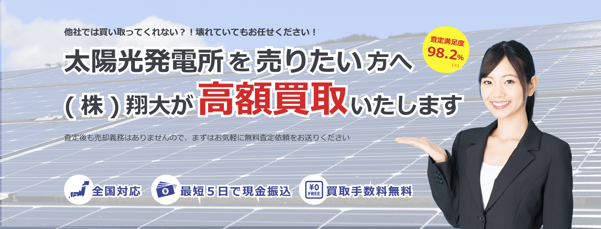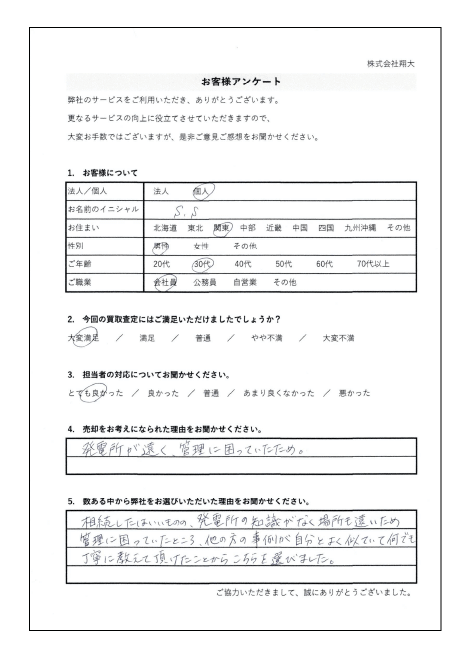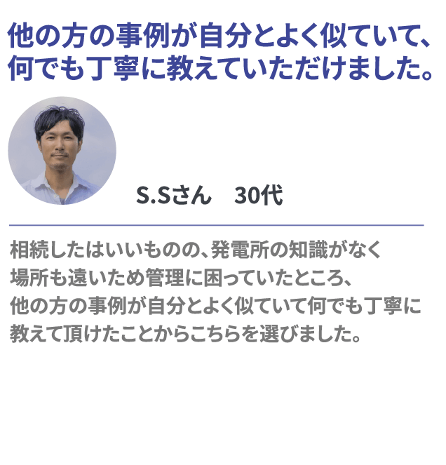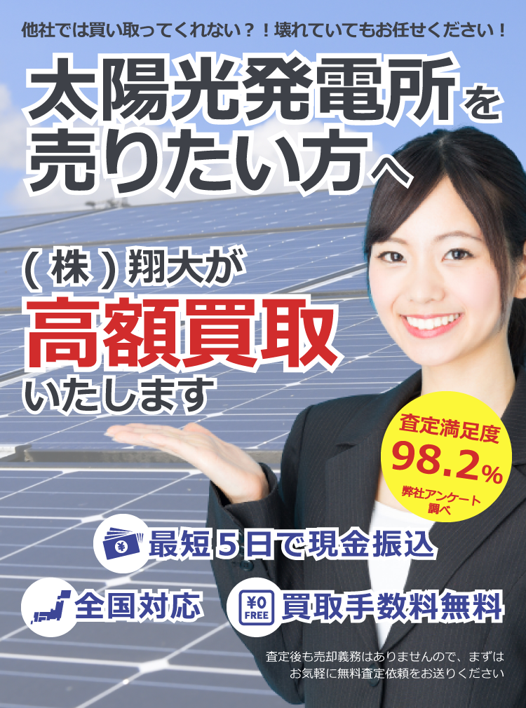 当社ではメンテナンス事業も行っているため、様々な発電所を高額で買取可能です。 経験豊富なアドバイザーがあなたの専任となって売却の全てをサポートいたします。 確定申告や税務のアドバイスも無料で行っております! 査定から契約、登記まで丁寧にご説明させていただきながら進めてまいります。 どんな発電所でもお気軽にご相談ください。